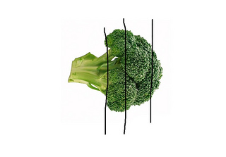 2. Place the first head of broccoli on your cutting board parallel to you, so that the stem end is at your left hand and the floret end at your right hand. Slice the broccoli heads cross wise, as seen in this diagram: