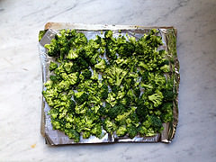3. Place all the broccoli on your baking sheet and toss with a generous amount of olive oil so that the broccoli is nicely coated with oil. Spread the broccoli out on the baking sheet, and sprinkle all the broccoli with salt and two pinches of the chile flakes. Place the broccoli in the oven and allow to roast for 20-25 minutes. Keep a close eye on the broccoli, if it seems to be cooking unevenly then stir it around and redistribute it. When the broccoli is cooked through and the ends of the broccoli are dark and crispy, remove the broccoli and set aside.